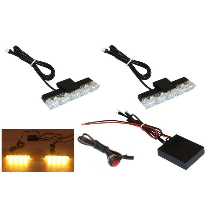 STROBOSKOPY LED 2x4W / 2 KANAŁY ŻÓŁTE SLIM Zbudowane w oparciu o 2 panele (lampy diodowe), każdy o mocy 4W świecące w kolorze żółtym. Komplet składa się z centralki sterującej , modułu sterującego z przyciskiem zmiany programu oraz 2 lamp LED Poniżej znajduje się link do filmiku obrazującego pracę stroboskopów (w wersji świecącej na biało) Sterownik umożliwia świecenie w jednym z ośmiu dostępnych sposobów. Układ posiada pamięć programu - po wyłączeniu zasilania i ponownym włączeniu stroboskopy startują z ostatnim ustawionym sposobem migania. Zmiany programu dokonujemy za pomocą włącznika zmiany programów wyprowadzonego na zewnątrz sterownika. Na panelu znajduje sterującym znajdują się diody LED sygnalizujące sposób świecenia stroboskopów.